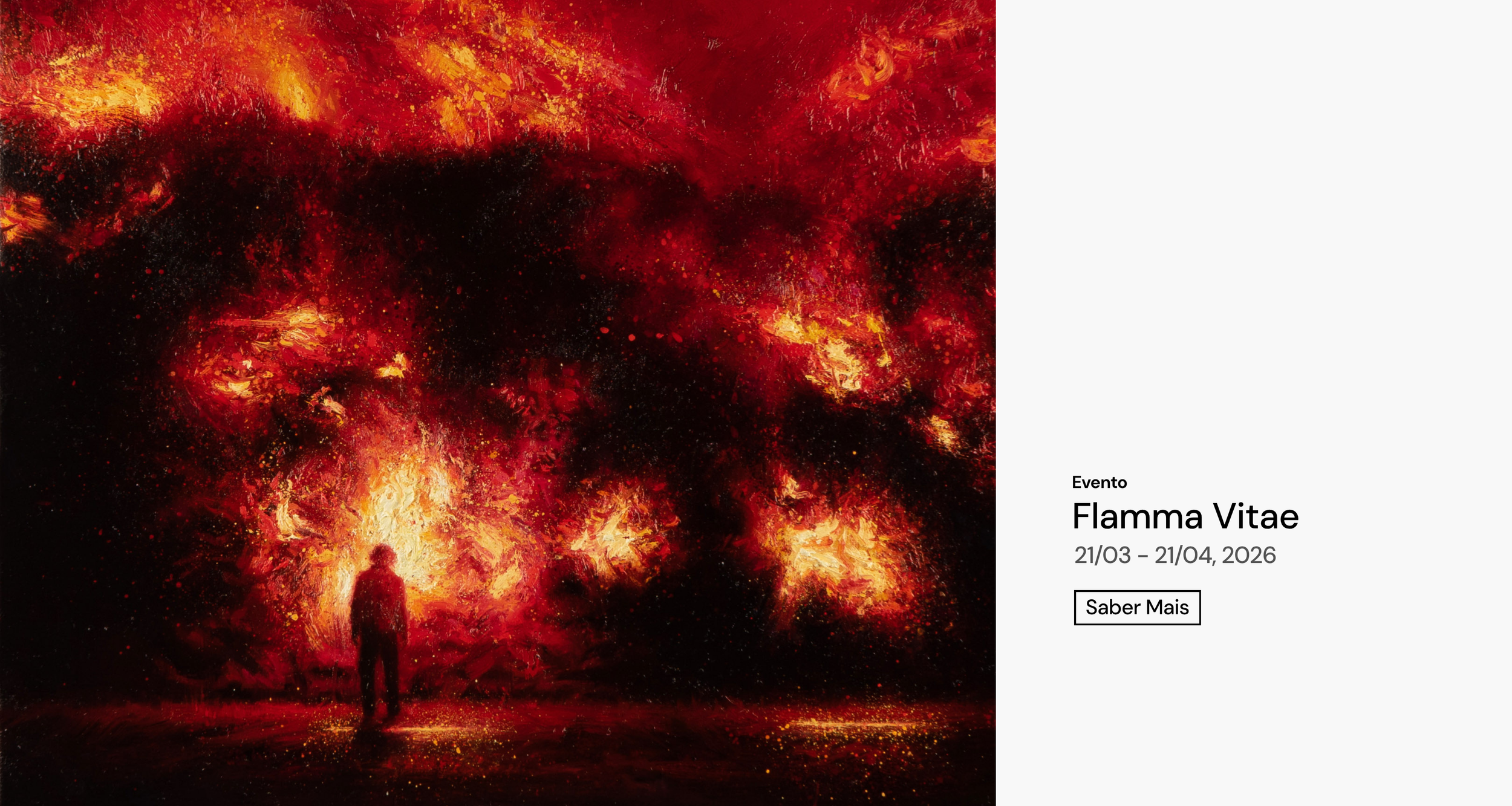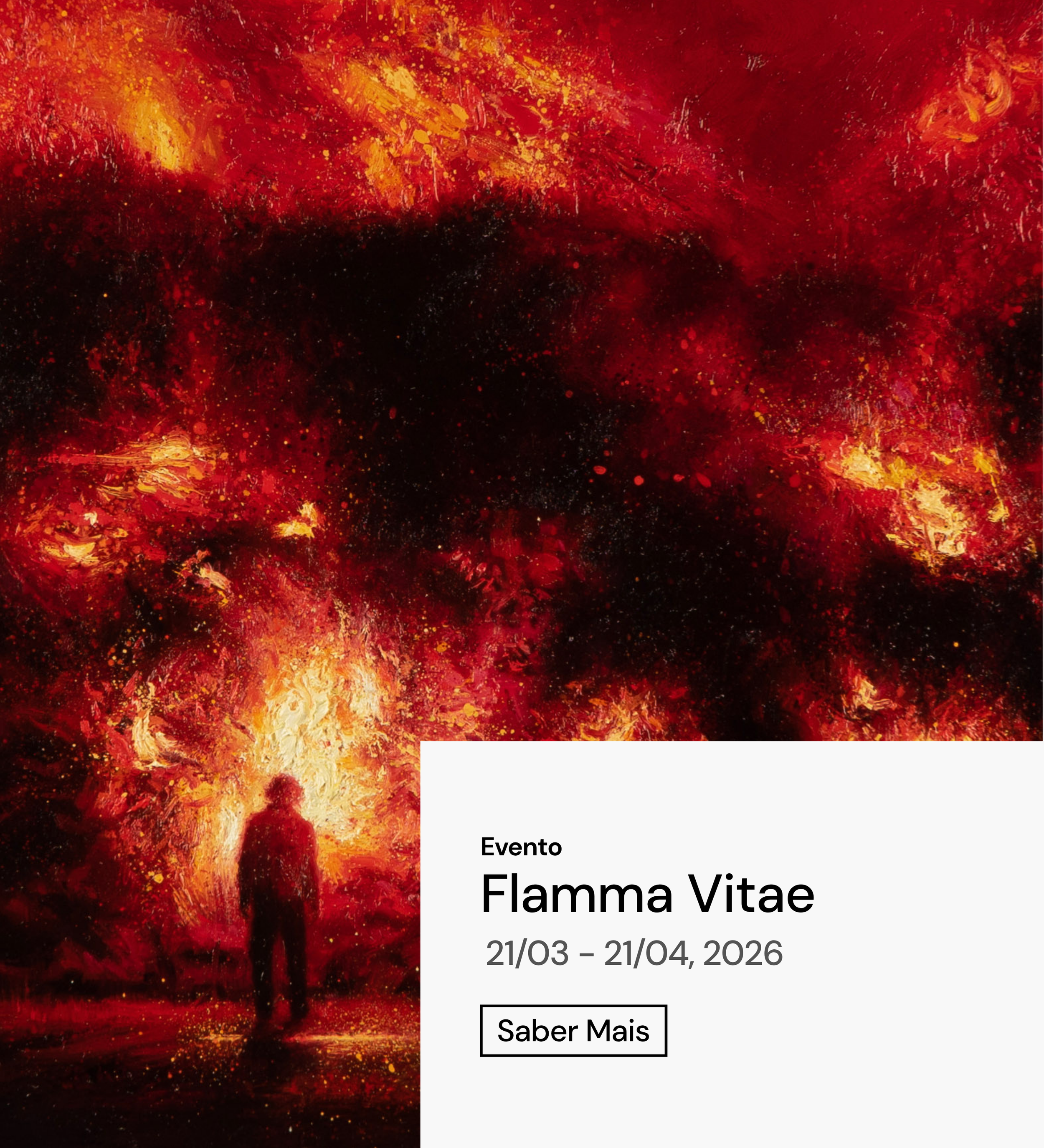 A abertura será assinalada com a exposição Flamma Vitae, que reúne obras de Rafael Oliveira, Daniel Gamelas e José Cunha. A mostra apresenta um conjunto de trabalhos que atravessam a pintura e a escultura, propondo um encontro entre diferentes linguagens plásticas. Entre matéria, gesto e forma, as obras exploram distintos modos de construir a imagem e o objeto artístico, convocando também a dimensão sensorial da experiência estética. A intensidade da imagem e da matéria convida o visitante a uma relação mais atenta com a obra, onde olhar, percepção e emoção se cruzam na construção de significado.